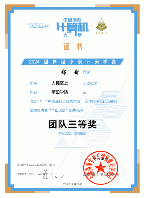 中国高校计算机大赛国家级团队三等奖